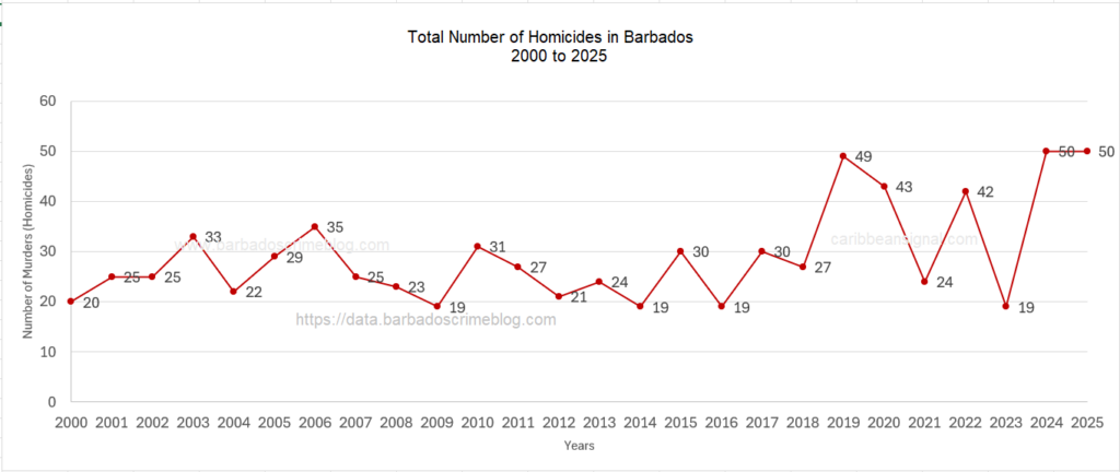 There have been at least 761 homicides (2000–2025) in Barbados — roughly 30 per year on average.