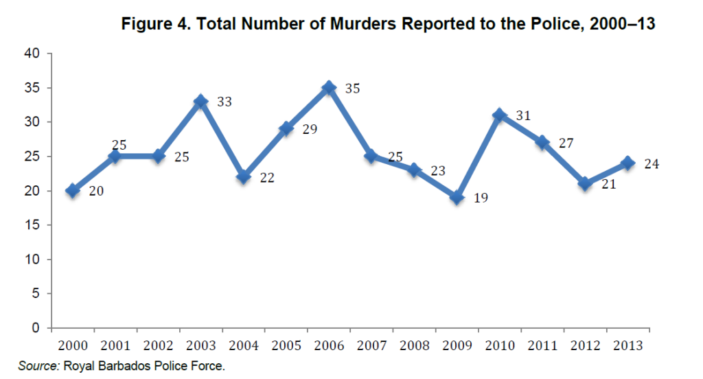 • 2000–2013 figures are from an Inter-American Development Bank (IDB) report based on data from The Barbados Police Service.